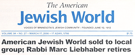 An article on the front page of the Jewish World’s March 17, 2006, issue announced a change of ownership at the perdurable newspaper of Minnesota’s Jewish community. The headline read: “American Jewish World sold to local group; Rabbi Marc Liebhaber retires.”