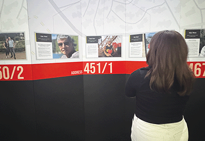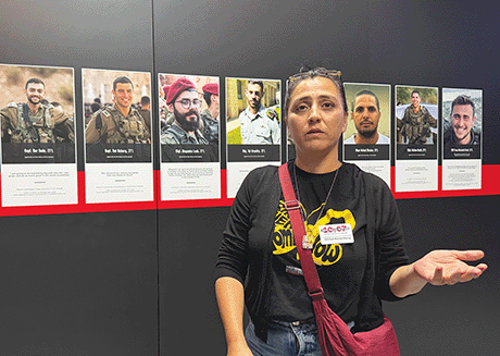 The names, pictures and stories of the 64 murdered civilians line the outer walls of the exhibit, with a back wall for the 18 hostages taken from the kibbutz and displays for the first responders and fallen rescue forces. Visitors may see some familiar faces on these walls — hostages who made headlines, such as the now-released Keith Siegel, as well as the late Netta Epstein, who spent a few summers at Herzl Camp as a camper and then as an ozo (counselor in training) in 2018.