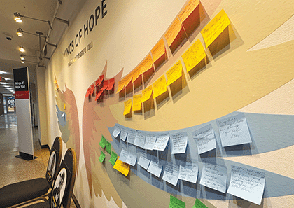 Finally, the exhibition closes with the rainbow Wings of Hope Wall, where visitors can add their own messages of support, prayer or reflection to be delivered to the Kfar Aza community. The message accompanying the wall: “Hope dies last. Let your words be the light in our darkness.”