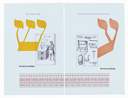 Lynne Avadenka’s “Handy-Works 2” (2022), a letterpress print from wood and metal type on photopolymer plates, incorporates verses from Proverbs extolling women. The images came from Moxon’s 1683 volume, The Doctrine of Handy-Works/The Whole Art of Printing. (Courtesy of Lynne Avadenka)