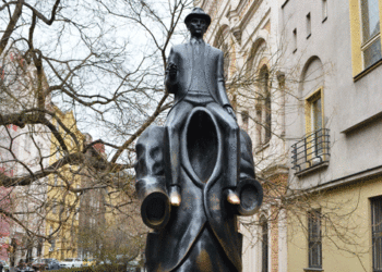 The esteemed 20th century author Franz Kafka, a Jewish native of Prague, was honored with an outdoors sculpture, on a ...