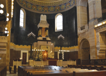 An interior view of the Spanish Synagogue in Venice, Italy. Construction of the largest and best known of the Venetian ...