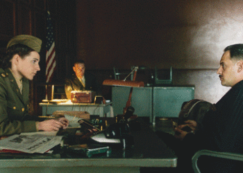 LIVING BY THEIR WITS — Army investigator Sara Simon (Antje Traue) interrogates David Bermann (Moritz Bleibtreu), a Holocaust survivor living ...