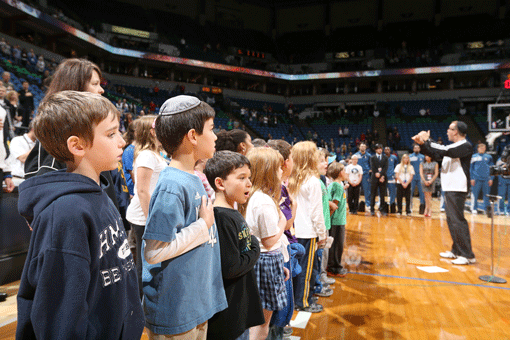 The chorus of the Heilicher Minneapolis Jewish Day School sang “Hatikvah,” the Israeli national anthem, and “The Star Spangled Banner,” prior to Tuesday night’s basketball game between the Minnesota Timberwolves and Maccabi Bazan Haifa.